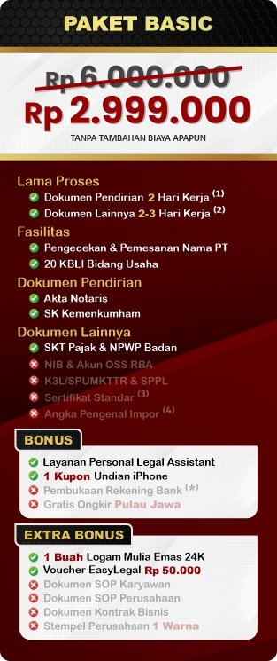Note: Harga berlaku untuk modal dasar ≤ Rp 1 Milyar | ⁽¹⁾ Setelah tanda tangan Minuta Akta | ⁽²⁾ SKT Pajak dikirim oleh KPP dalam 1-3 bulan | ⁽³⁾ Resiko menengah rendah | ⁽⁴⁾ Opsional | ⁽*⁾ Syarat & Ketentuan Berlaku