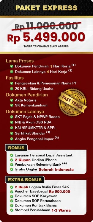 Pendirian Perseroan Terbatas (PT) di Indonesia tidak hanya meningkatkan reputasi bisnis Anda, tetapi juga memberikan perlindungan hukum serta membuka peluang untuk pertumbuhan dan perkembangan lebih lanjut. EasyLegal sebagai jasa pembuatan PT saat ini mengadakan Legal Festival Special Deal, sebagai bentuk dukungan untuk UMKM Indonesia.